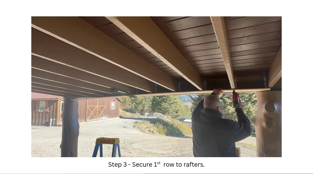 (3) Secure the T&G Installation Helper using a #10, 3 1/2" washer head wood screw (not included) on the rafter of your choosing. This depends on how your laying out your rows.